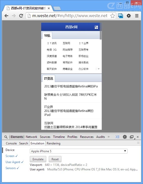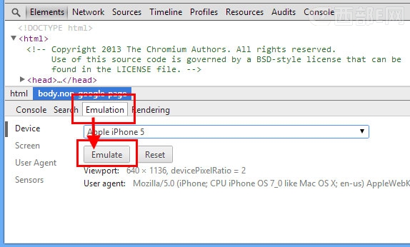 4、這個界面就一目了然了,Device里面可以選擇各種手機或者平板設(shè)備,大概有20種之多。User Agent和Sensors顯示了模擬的數(shù)據(jù)。點擊“Emulate”按鈕就可以生效了。